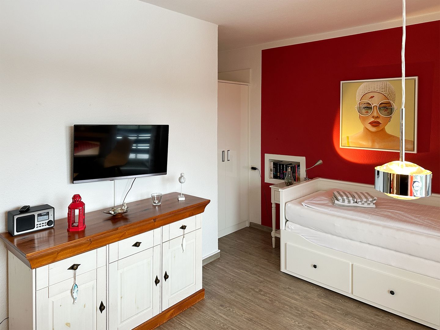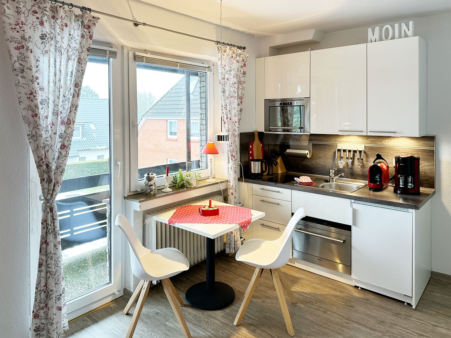 Die kleine Ferienwohnung "Wattenmeer" verfügt über einen kombinierten Wohn- Schlafraum mit WLAN, TV und offener Küche, ein Badezimmer mit Dusche und WC; einen überdachten Süd-Balkon (Loggia) mit Gartenmöbeln (April bis Oktober).